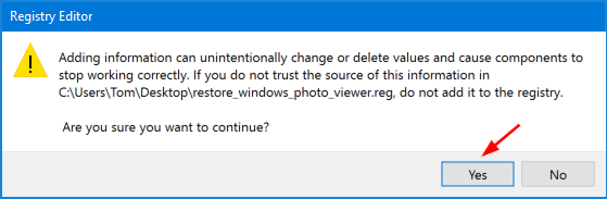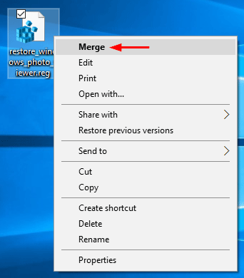 - 首先,下载restore_windows_photo_viewer.reg 文件并将其保存到您的Windows 10 计算机。接下来,右键单击该文件并选择合并。如果出现 UAC 提示,请单击是的。