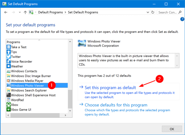 - 选择Windows 照片查看器从列表中,然后单击将此程序设置为默认程序在右侧。