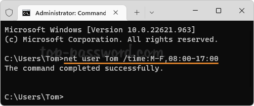 - 输入适当的净用户/时间您希望限制其访问的用户的命令。