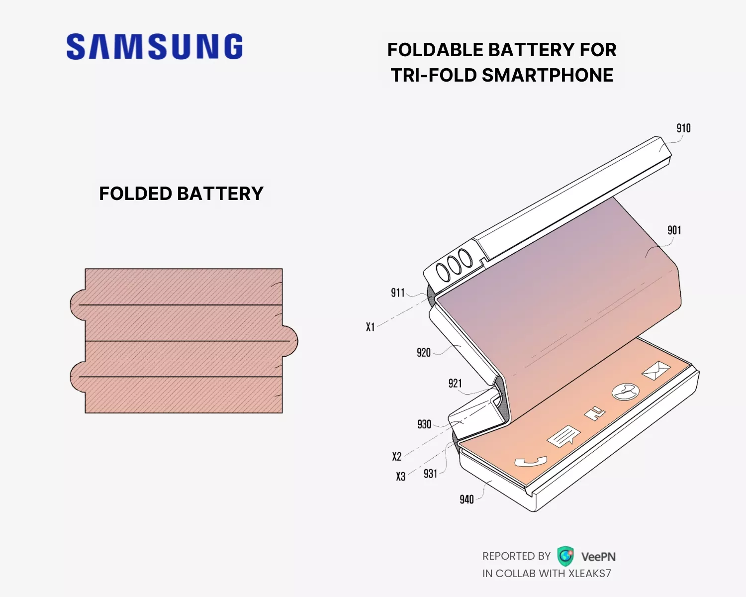 三星已获得用于三折智能手机的可折叠电池专利 |图片来源:VeePN