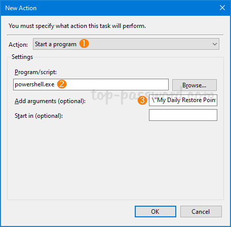 -ExecutionPolicy Bypass -Command "Checkpoint-Computer -Description \"My Daily Restore Point\" -RestorePointType \"MODIFY_SETTINGS\""
