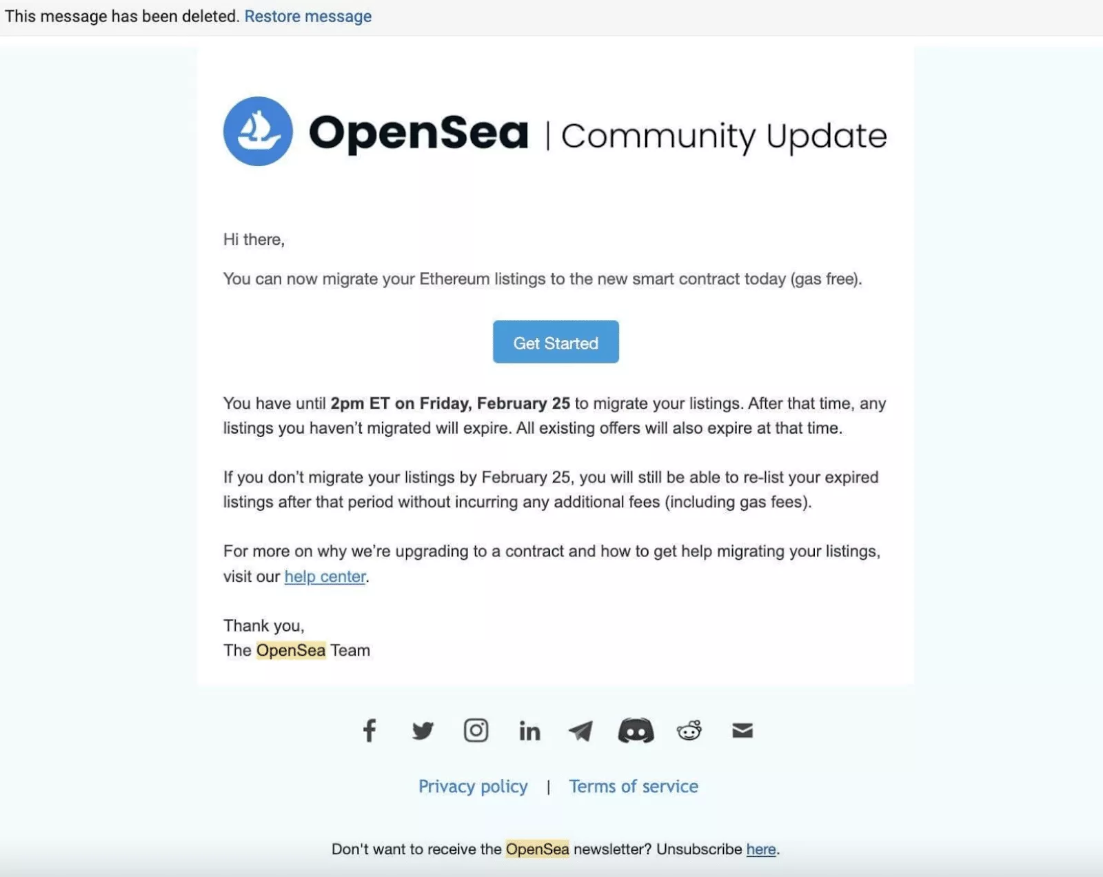 这是NFT网络钓鱼骗局的一个典型例子。乍一看,这似乎是Opensea支持团队发送的一封真正的电子邮件。它要求您将您的以太坊列表迁移到新的智能合约,并提供相应的链接。但是,一旦您单击它并填写建议的表格,您的凭据将最终落入错误的手中。