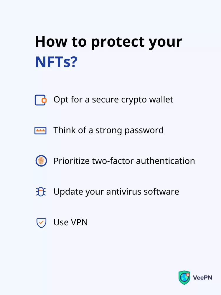 尽管区块链解决方案相对安全,但购买和销售NFT仍然很冒险。这是由于许多骗局,虚假的投资计划以及其他努力损害用户安全的恶意技术。因此,最好保护自己并坚持最有效的安全措施。特别是,您可以使用VPN,更新防病毒软件并创建可靠的加密钱包。