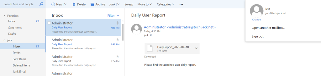 最后,我们将生成的报告附加在电子邮件中并发送给用户 jack。
