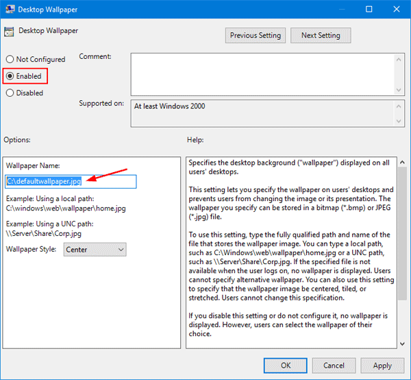 - 选择启用选项,然后键入要设置为默认背景的图像的路径。点击申请和好的。