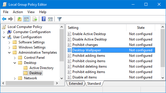 - 在本地组策略编辑中,浏览到用户配置- >管理模板- >桌面- >桌面,然后双击桌面壁纸右侧的政策。