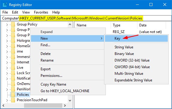 HKEY_CURRENT_USER\Software\Microsoft\Windows\CurrentVersion\Policies