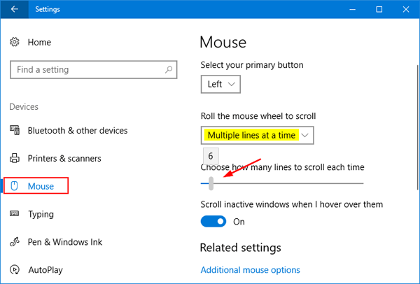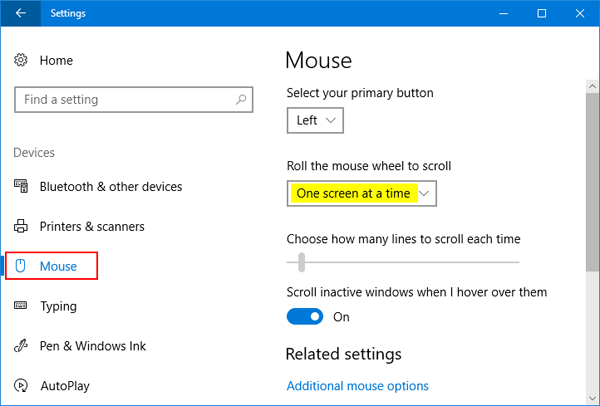 - 选择老鼠在左侧,您会看到各种鼠标配置设置。在“滚动鼠标滚轮进行滚动”设置,您可以选择“一次多行“ 或者 ”一次一个屏幕“。第一个是默认设置,这使得滚动更平滑、更慢。