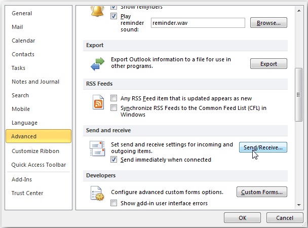 导航到“高级”选项卡并向下滚动到发送和接收部分。然后单击发送/接收按钮。