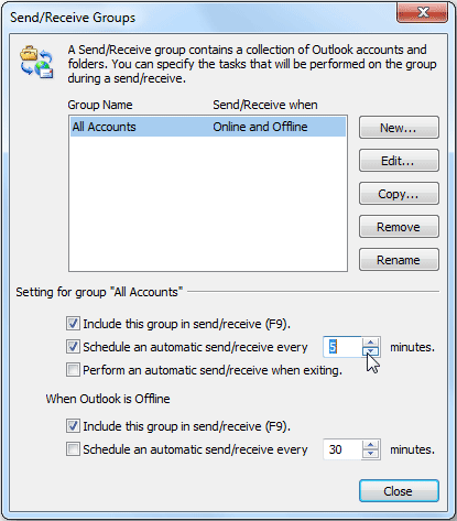 在发送/接收组窗口中,选择名为的组所有账户。对话框底部有所选组的发送/接收选项列表。如果您想要从发送和接收项目中删除任何选定的组,请禁用第一个选项。从安排自动发送/接收,输入所需的时间间隔,之后它将自动安排发送/接收邮件。