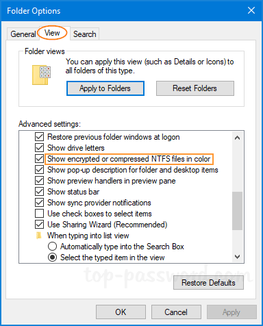 - 当“文件夹选项”窗口打开时,单击看法选项卡并选中名为“以彩色显示加密或压缩的 NTFS 文件”。