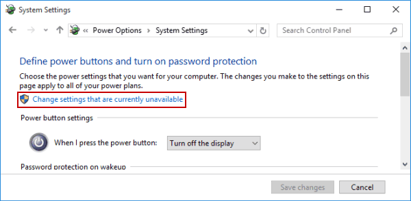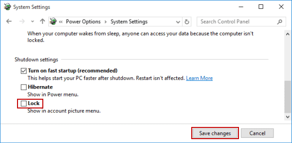 步骤4:取消选择锁在关机设置下,然后点击保存更改。