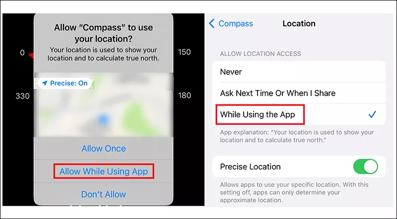 然后打开 iPhone/iPad Compass,它通常预装在所有 iPhone 和 iPad 上。当提示是否允许指南针使用您的位置时,选择“使用应用程序时允许”。这将帮助 iPhone 指南针显示更多您需要的相关信息。