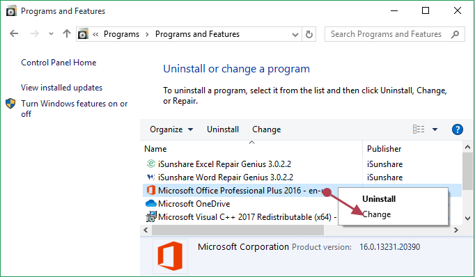 步骤 3:找到 Microsoft Office 并右键单击它进行选择改变选项。