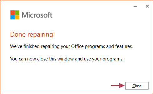 步骤6:关闭“完成修复”提示框。然后打开 MS Excel 文件以查看问题是否已解决。