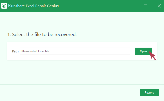 步骤 2:运行 Excel 恢复工具并单击打开按钮添加有问题的 .xlsx 文件。