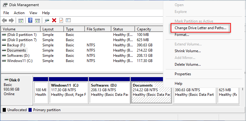 步骤3:右键单击它并选择更改驱动器号和路径...选项。