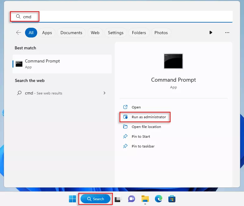 步骤一:点击搜索任务栏中的图标。然后在搜索框中输入“cmd”并选择