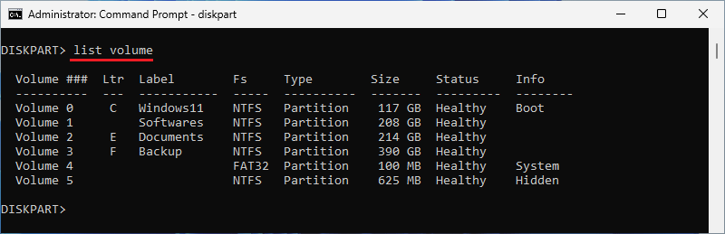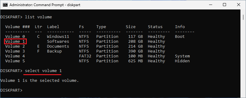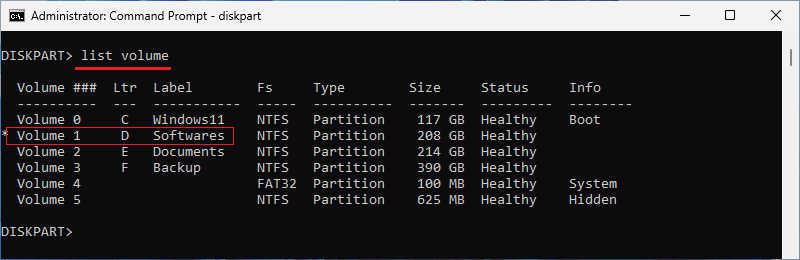 进入列出磁盘的所有卷。如面板所示,第 1 卷的字母是
