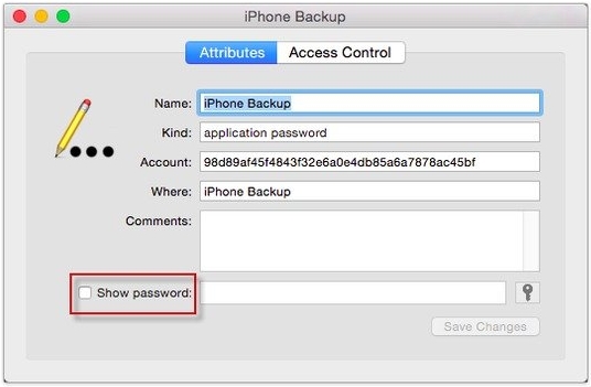 - 切换到属性,勾选旁边的方框显示密码,并根据需要输入 Mac 的管理员密码。然后,您就可以看到iTunes备份密码。