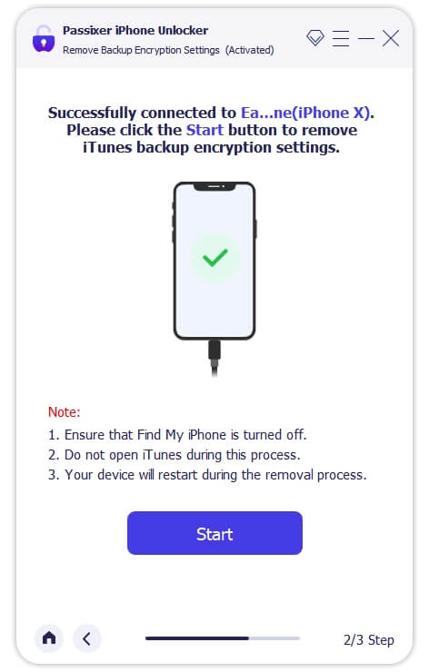 接下来,您必须连接要删除 iTunes 备份加密的 iPhone,然后单击开始当 Passixy 检测到您的设备时。