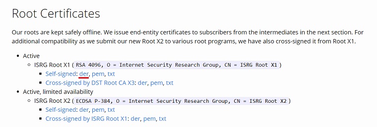 - 向下滚动并下载 ISRG Root X1 根证书作为自签名 Der 文件。
