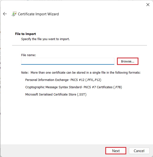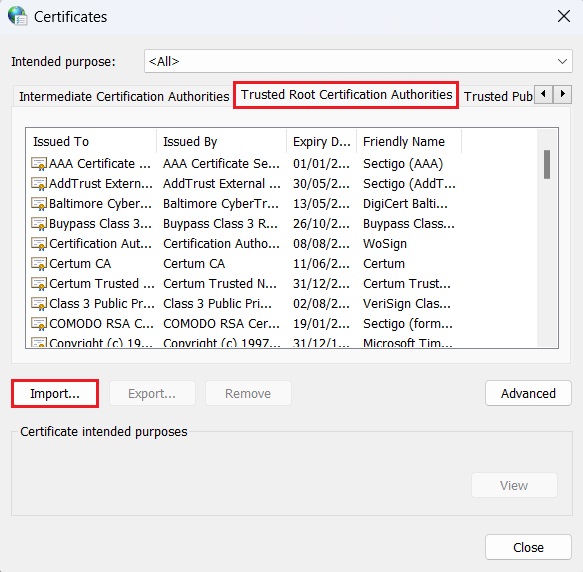 - 在新的证书窗口,转到受信任的根证书颁发机构选项卡并单击导入。