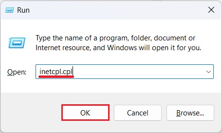 - 按Windows + R开始跑步并输入inetcpl.cpl并按好的。
