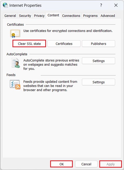 - 现在在Internet 属性内容选项卡点击清除 SSL 状态然后单击申请然后好的。