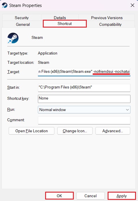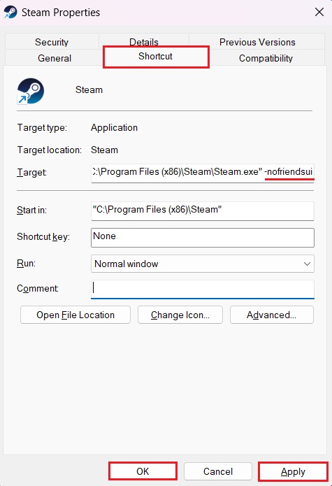- 下捷径选项卡转到目标并输入“-nofriendsui”。 (没有“”)