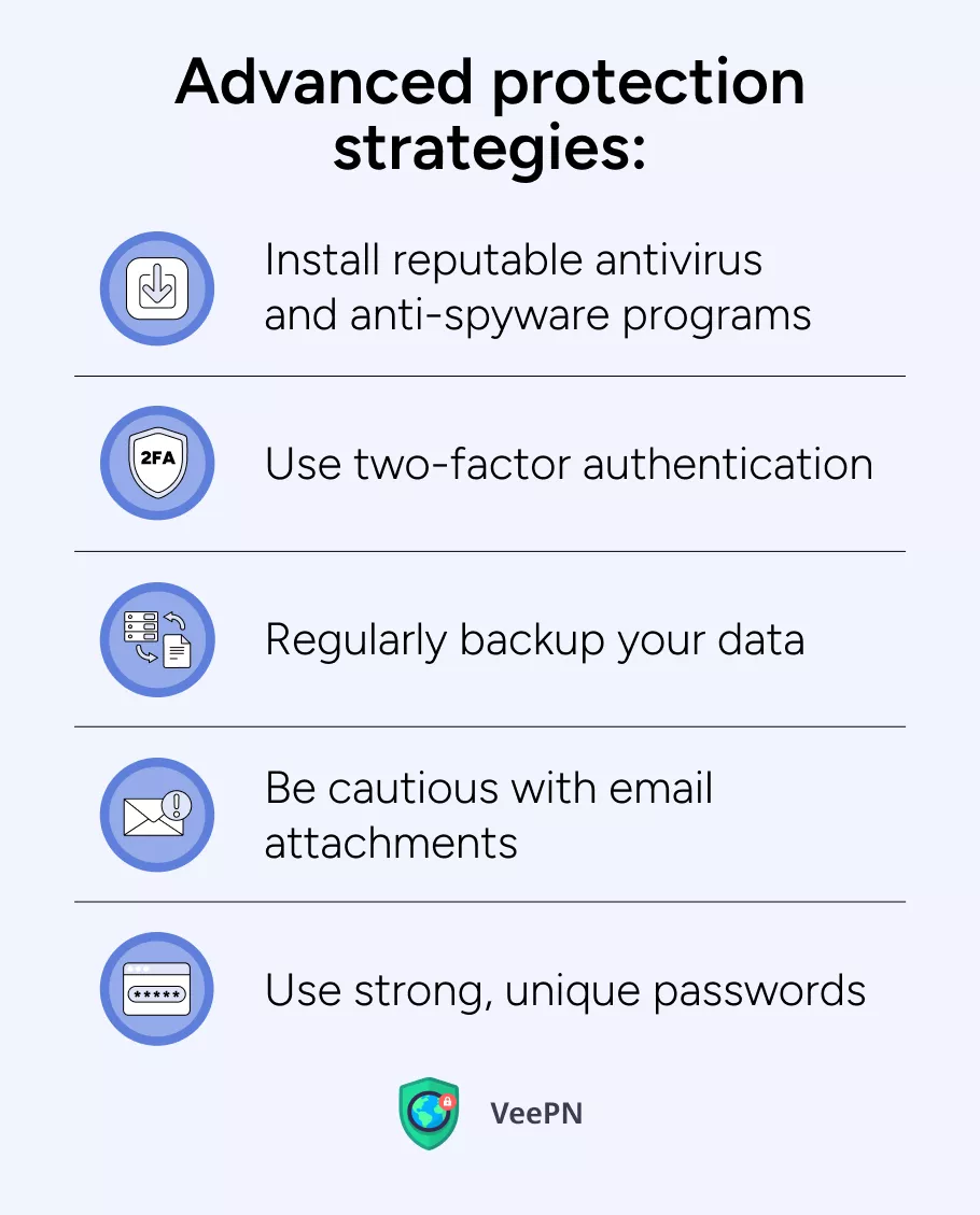 无需说明显而易见的事实,但确保自己免受此风险以及恶意软件和勒索软件等其他危险的影响至关重要。在本文中,您将了解间谍软件的风险、间谍软件如何进入设备,以及如何使用 VeePN 等有效的技术和工具来保证强大的间谍软件保护。听起来不错吗?那么我们继续吧?
