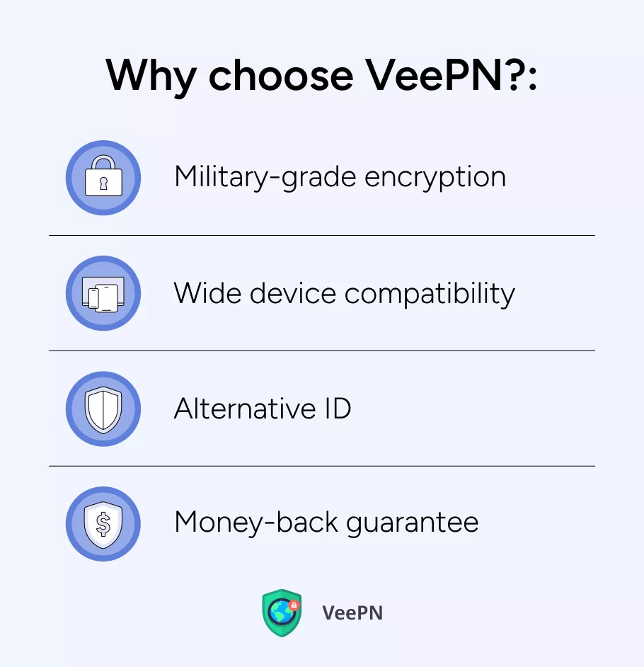 相反,不要拿您的在线安全冒险,请尝试 VeePN — 一项高级 VPN 服务。让我们看看为什么 VeePN 可以成为适合您的优秀反间谍软件!