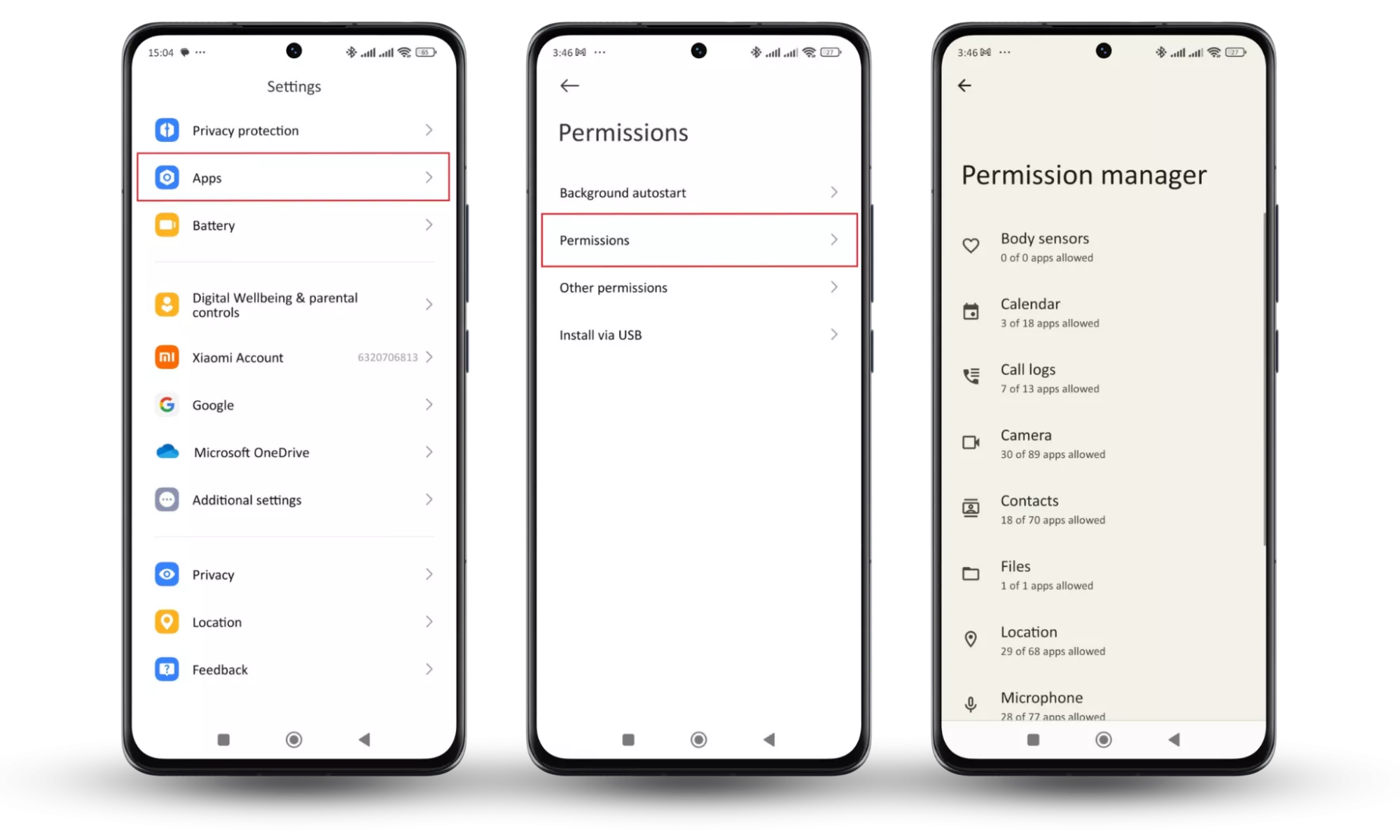 步骤 1-4:设置 > 应用程序 > 权限 > 查看权限。
