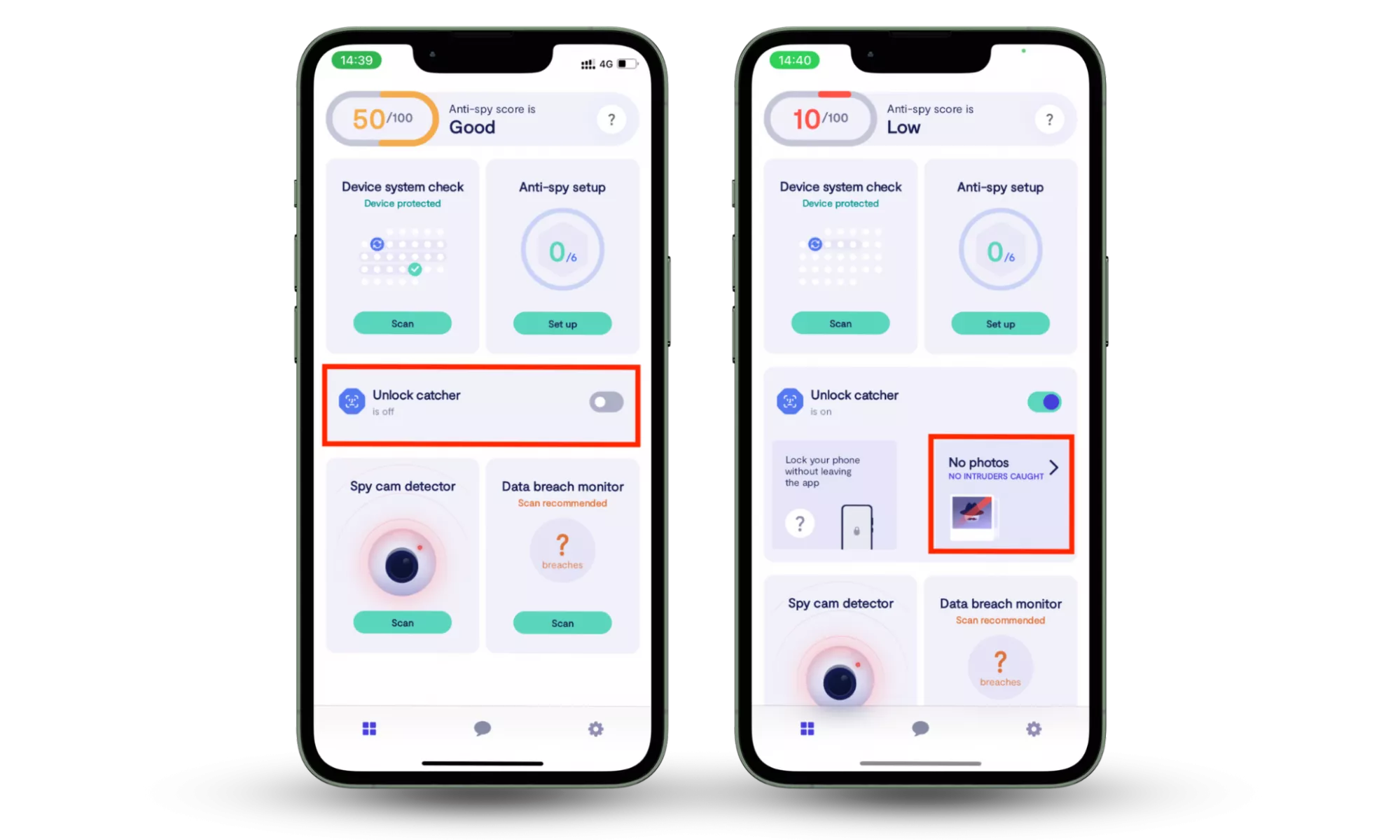 如果有人试图未经许可解锁您的手机,入侵者检测应用程序(例如 Clario Anti Spy Unlock Catcher)可以向您发出警报。有些人突然发出很大的声音。然而,Clario 反间谍 开锁 捕手该功能会秘密拍摄任何试图解锁您手机的人的照片,并将其存储在单独的报告中。