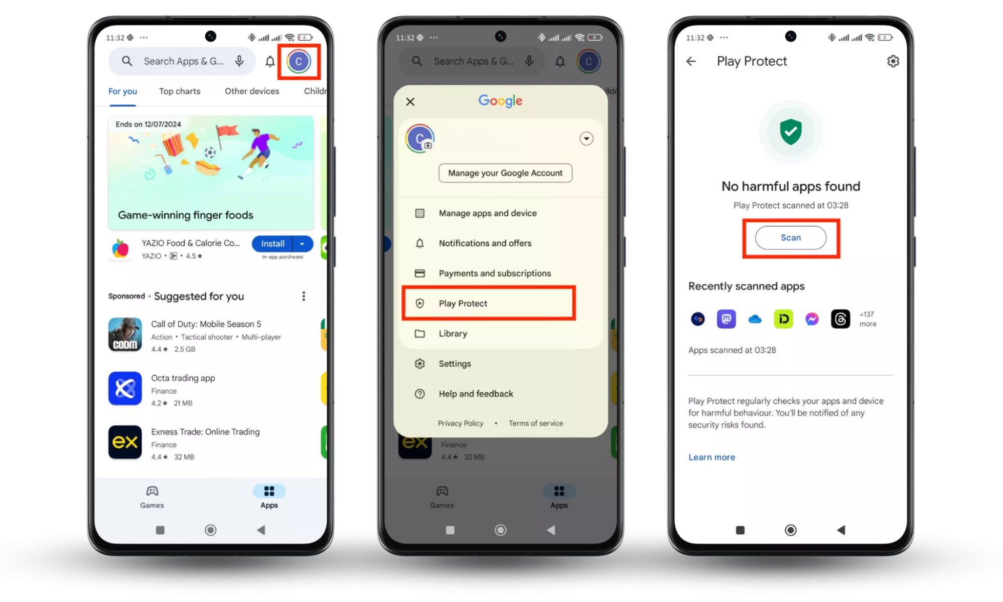 步骤 1-4:Google Play 商店 > 配置文件图标 > Play 保护 > 扫描。