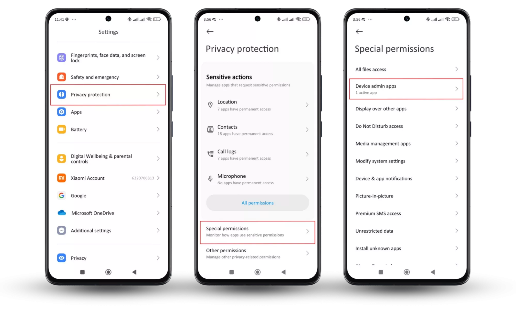 步骤 1-3:设置 > 隐私保护 > 特殊权限 > 设备管理应用