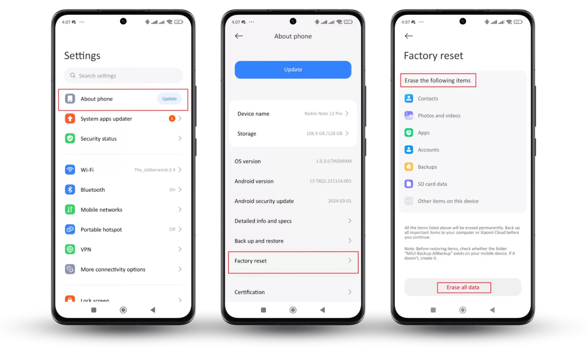 步骤 1-4:设置 > 关于手机 > 恢复出厂设置 > 选择要删除的数据或删除所有数据。