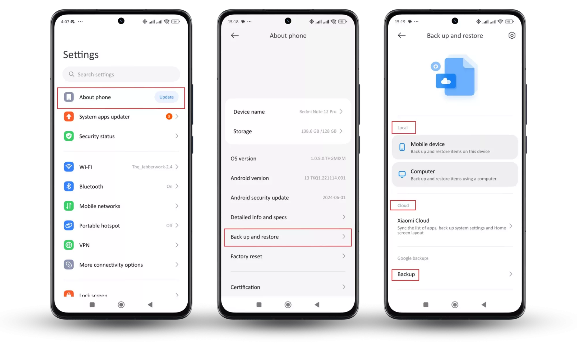 步骤1-3:设置 > 关于手机 > 备份和恢复 > 选择备份方式(本地、设备品牌云、Google 备份)。