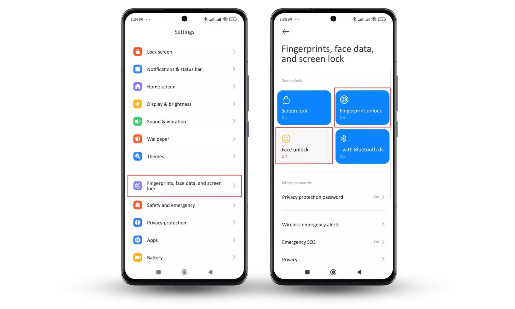 步骤1-3:设置 > 指纹、人脸数据和屏幕锁定 > 指纹解锁或人脸解锁 > 按照屏幕说明操作。