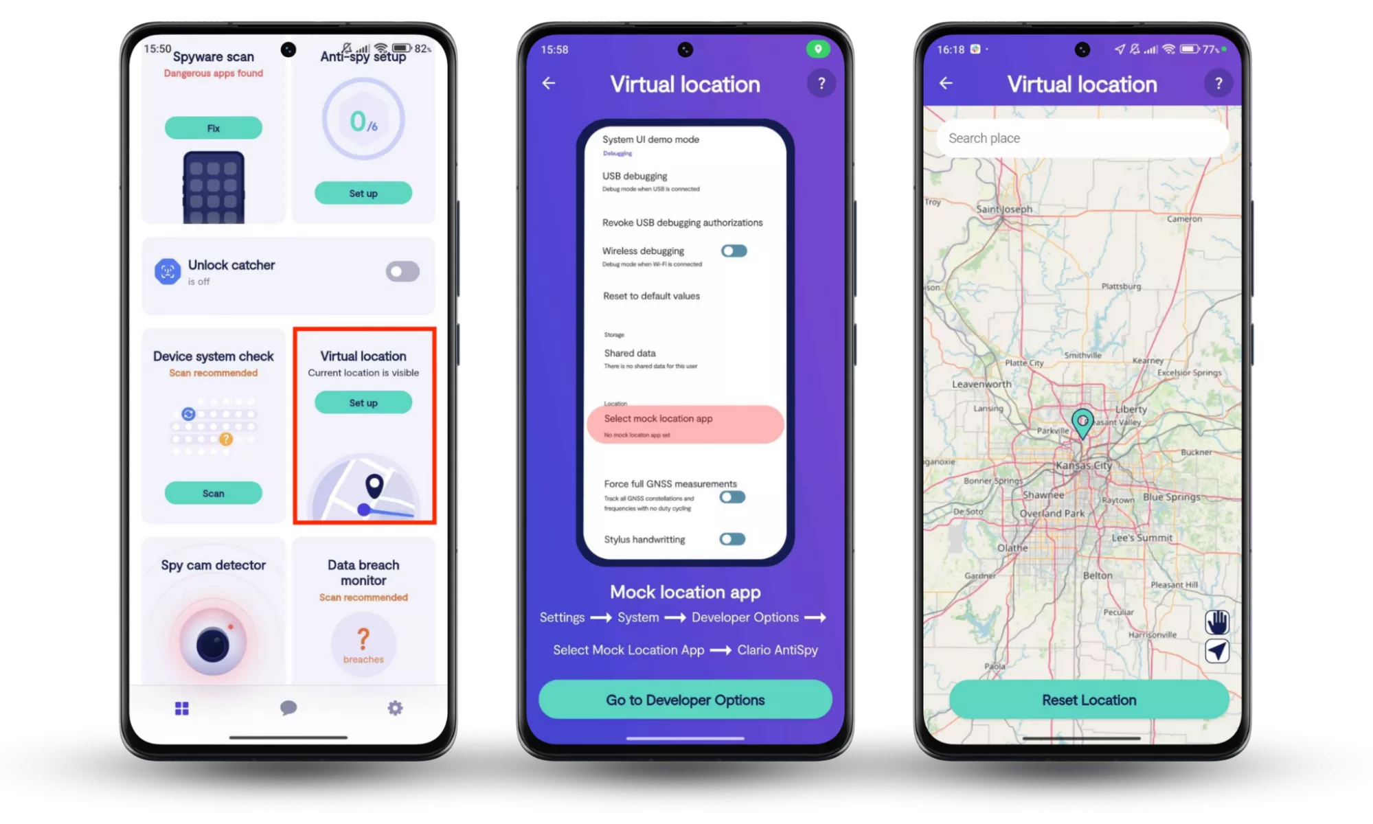 利用 Clario Anti Spy 的虚拟位置,随时随地保持匿名。在世界任何地方设置您的 Android 位置,并在地图上随机选择一个位置,以确保您的行踪私密。