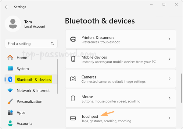 - 选择蓝牙和设备,然后单击触摸板在右侧。