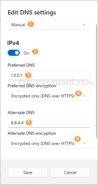 - 在弹出的窗口中,确保“编辑 DNS 设置”下拉列表设置为手动的。打开IPv4并输入支持 DoH 的主 DNS 服务器地址和辅助 DNS 服务器地址。选择“仅加密(通过 HTTPS 的 DNS)” 两个 DNS 服务器的选项。