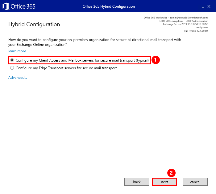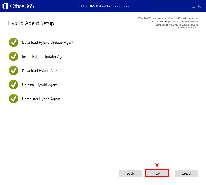 混合配置向导将检测最佳的 Exchange Server。点击下一个。
