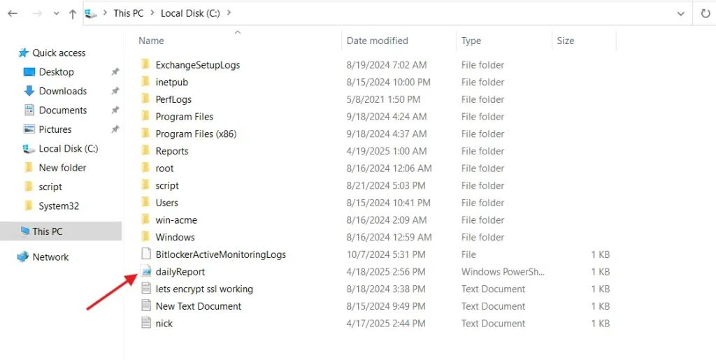 我们有以下名为 dailyReport.PS1 的脚本保存在 C 盘内。