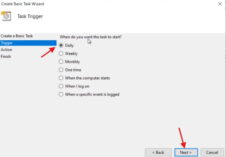 现在为任务命名,在我们的例子中,我们将其命名为“用户上次登录的每日报告”,然后单击“下一步”。