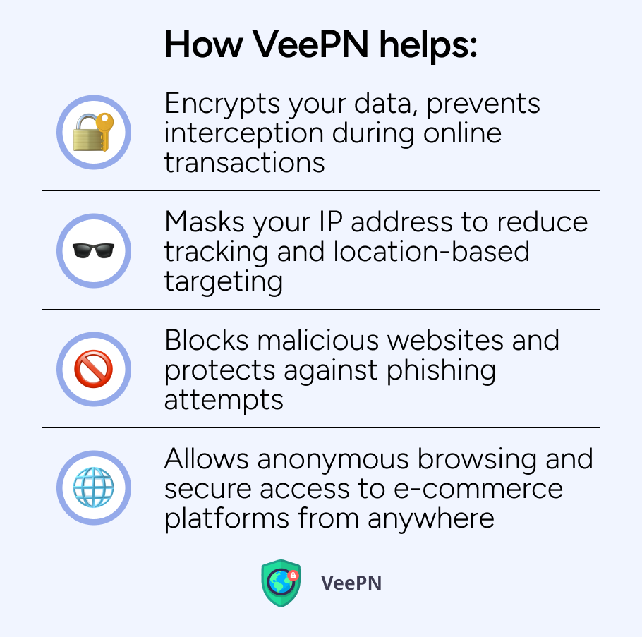 即使您最喜欢的电子商务平台声称是一流且安全的,威胁也可能来自多个角度,例如网络钓鱼、第三方跟踪器或重新利用旧漏洞数据。这就是像 VeePN 这样的虚拟专用网络 (VPN) 应用程序可以发挥巨大作用的地方。以下是 VeePN 提供的帮助: