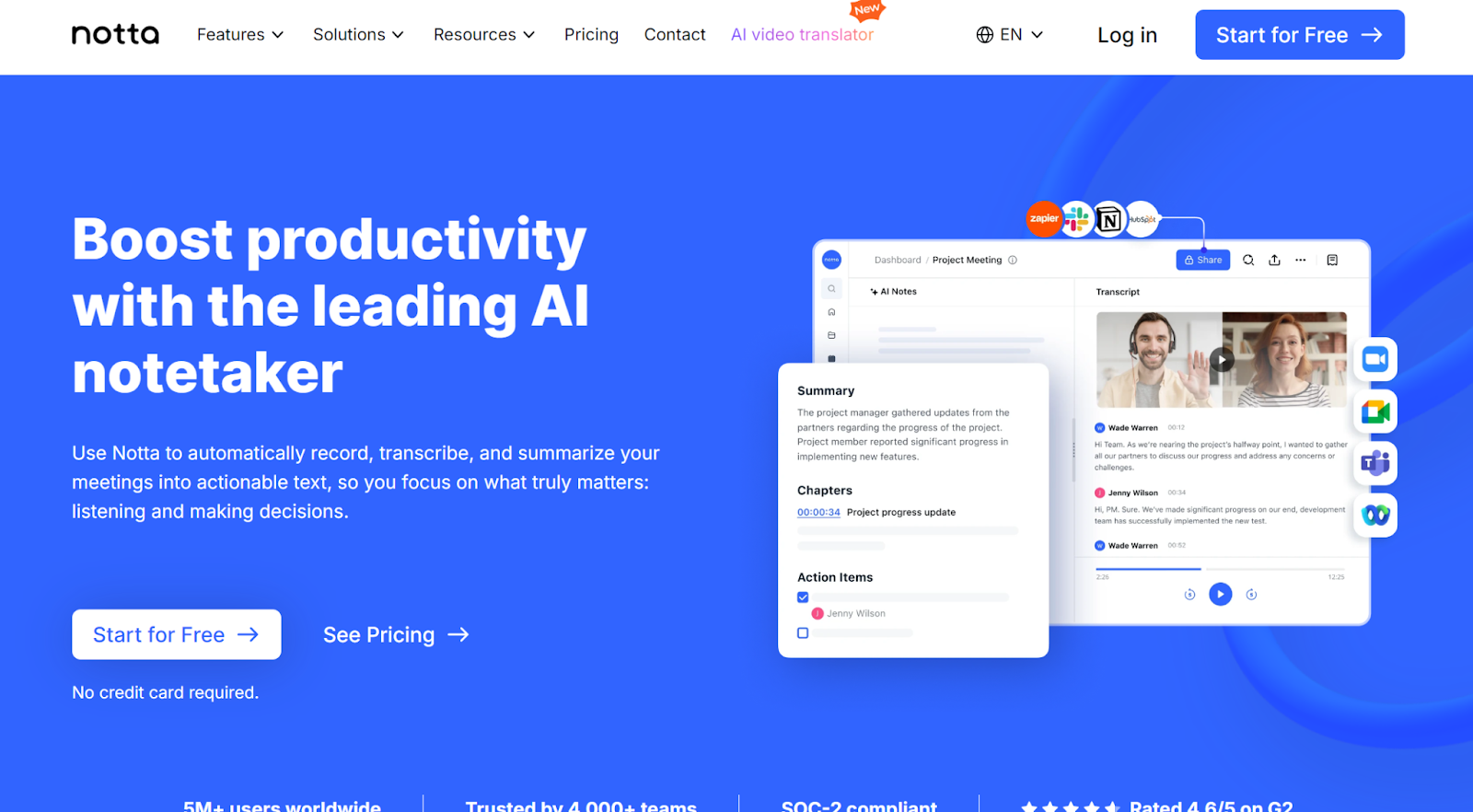 Notta 是一款用户友好的语音转文本软件,可为在线会议提供实时转录。它因其多语言支持而脱颖而出,使其成为全球运营团队的绝佳选择。 Notta 与流行的会议平台顺利集成,提供了一种跨不同语言捕获和管理会议内容的简单方法。