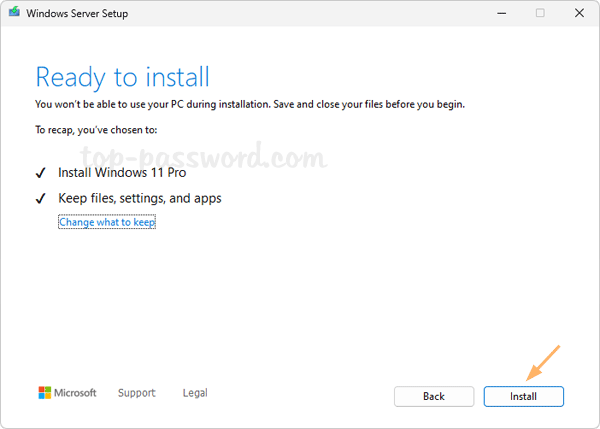 - 当出现“准备安装”窗口时,单击安装执行实际的就地升级过程。请耐心等待,因为这是最耗时的部分。
