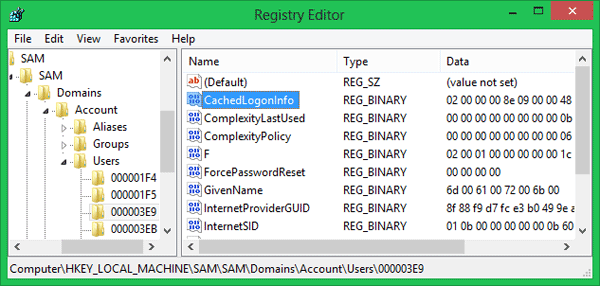 - 扩展Sam subkey并导航到子钥匙:hkey_local_machine \ sam \ sam \ domains \ account \ users \ 000003E9。这里000003E9是我的Microsoft帐户,在您的身边可能有所不同。