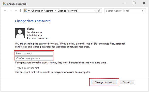 6. 在框中输入新密码两次,然后单击“更改密码”按钮。然后Windows 10用户密码就会被更改。如果您担心有一天会丢失密码,您可以为其设置密码提示,以便在 Windows 10 密码丢失时提醒您。